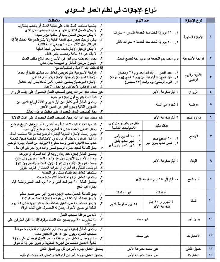 الاجازات في قانون العمل السعودي أنواع الإجازات وشروط ترحيلها مصر الجديدة