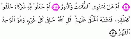 ق ل م ن ر ب الس م او ات و ال أ ر ض ق ل الل ه ق ل أ ف ات خ ذ ت م م ن د ون ه أ و ل ي اء ل ا ي م ل ك ون ل أ ن ف س ه م ن ف ع ا و ل ا ض ر ا ق ل ه ل ي س ت و ي ال أ ع م ى و ال ب ص ير أ م ه ل ت س ت و ي الظ ل م ات و الن ور أ م