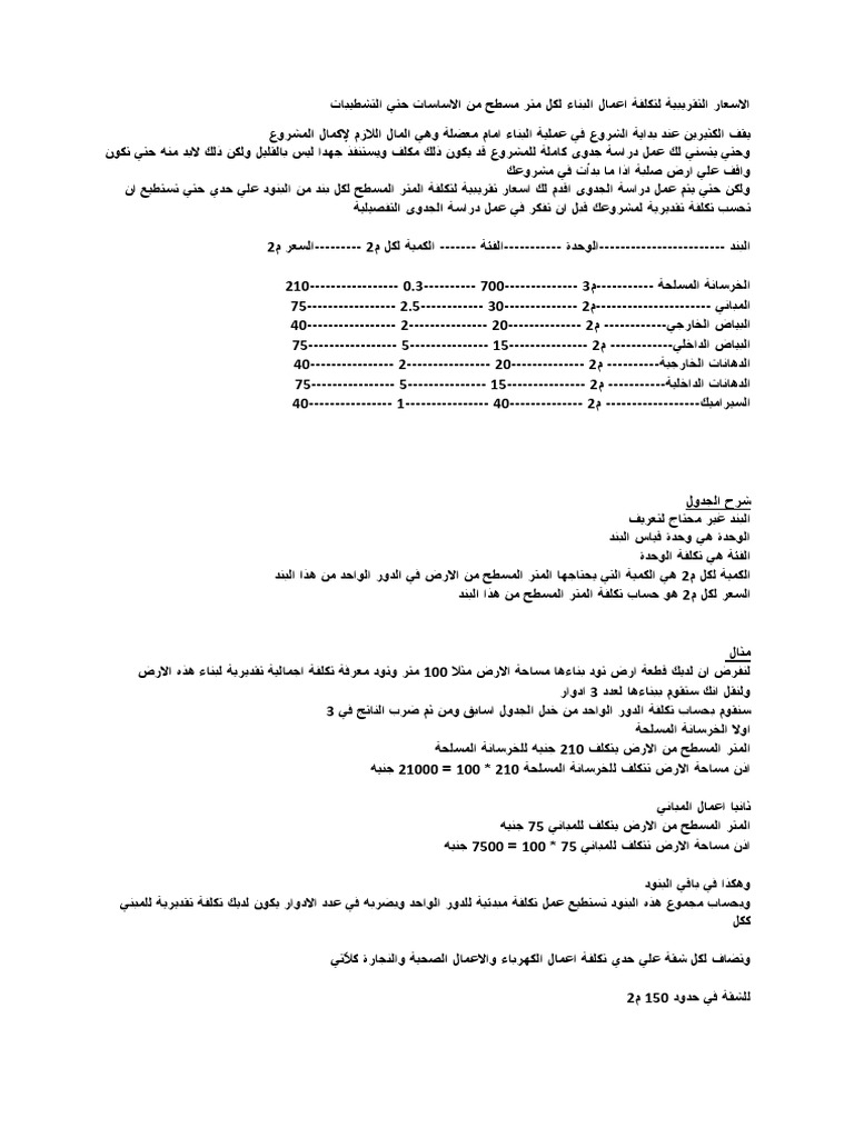 الاسعار التقريبية لتكلفة اعمال البناء لكل متر مسطح من الاساسات حتي التشطيبات