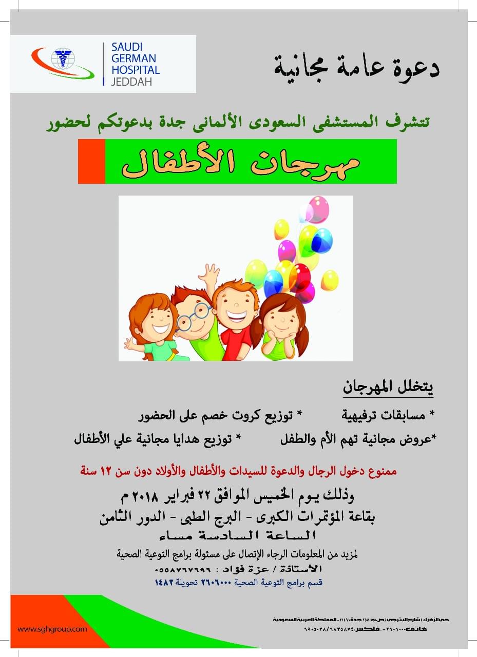 المستشفى السعودي الألماني جدة على تويتر نتشرف بدعوتكم لحضورمهرجان الأطفال وذلك يوم 22 فبراير 2018 ويتخلل المهرجان عروض مجانية تهم الأم و الطفل لمزيد من المعلومات الرجاء الإتصال على قسم البرامج التوعية