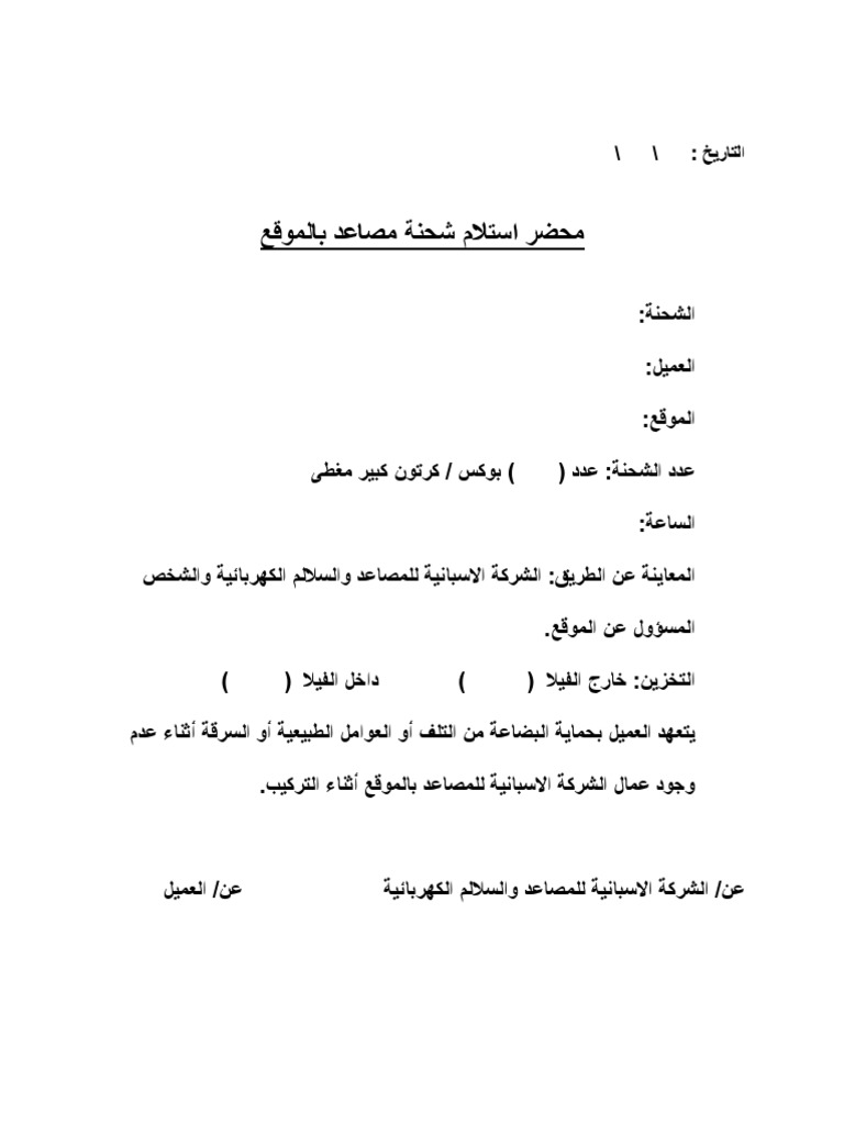 محضر استلام شحنة مصاعد بالموقع