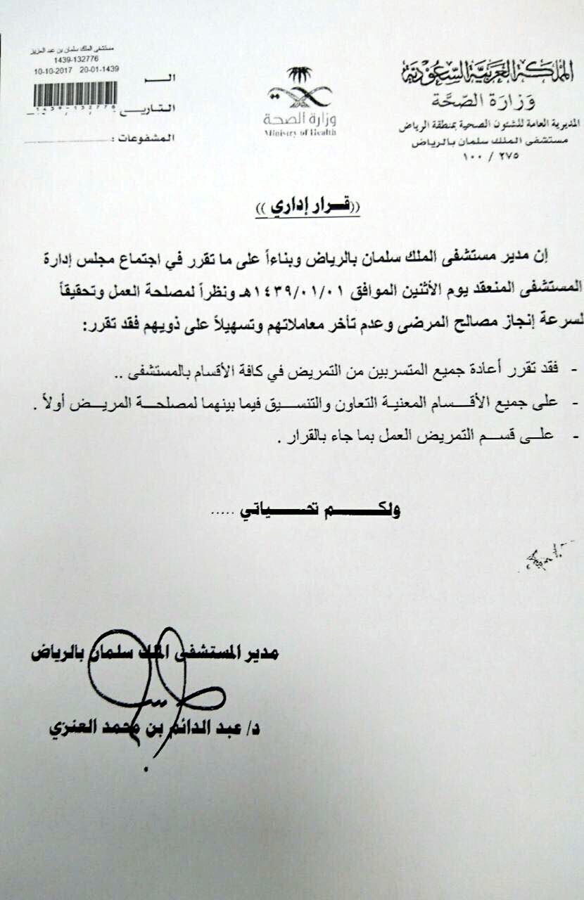 الأخبار الصحية בטוויטר مستشفى الملك سلمان إعادة جميع المتسربين من كادر التمريض للاقسام الاخرى بالمستشفى وتوجيه الاقسام بالتعاون لتنفيذ ذلك