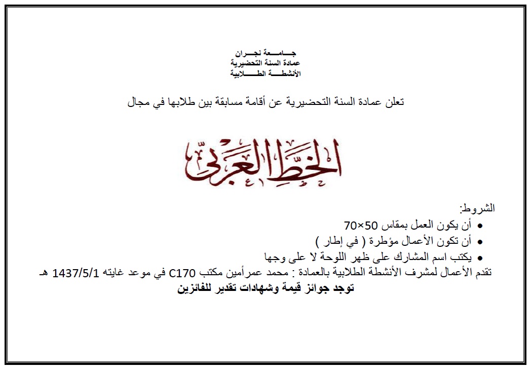 Deanship Of Preparatory Year Guideline إعلان عن مسابقة الخط العربي الإعلانات